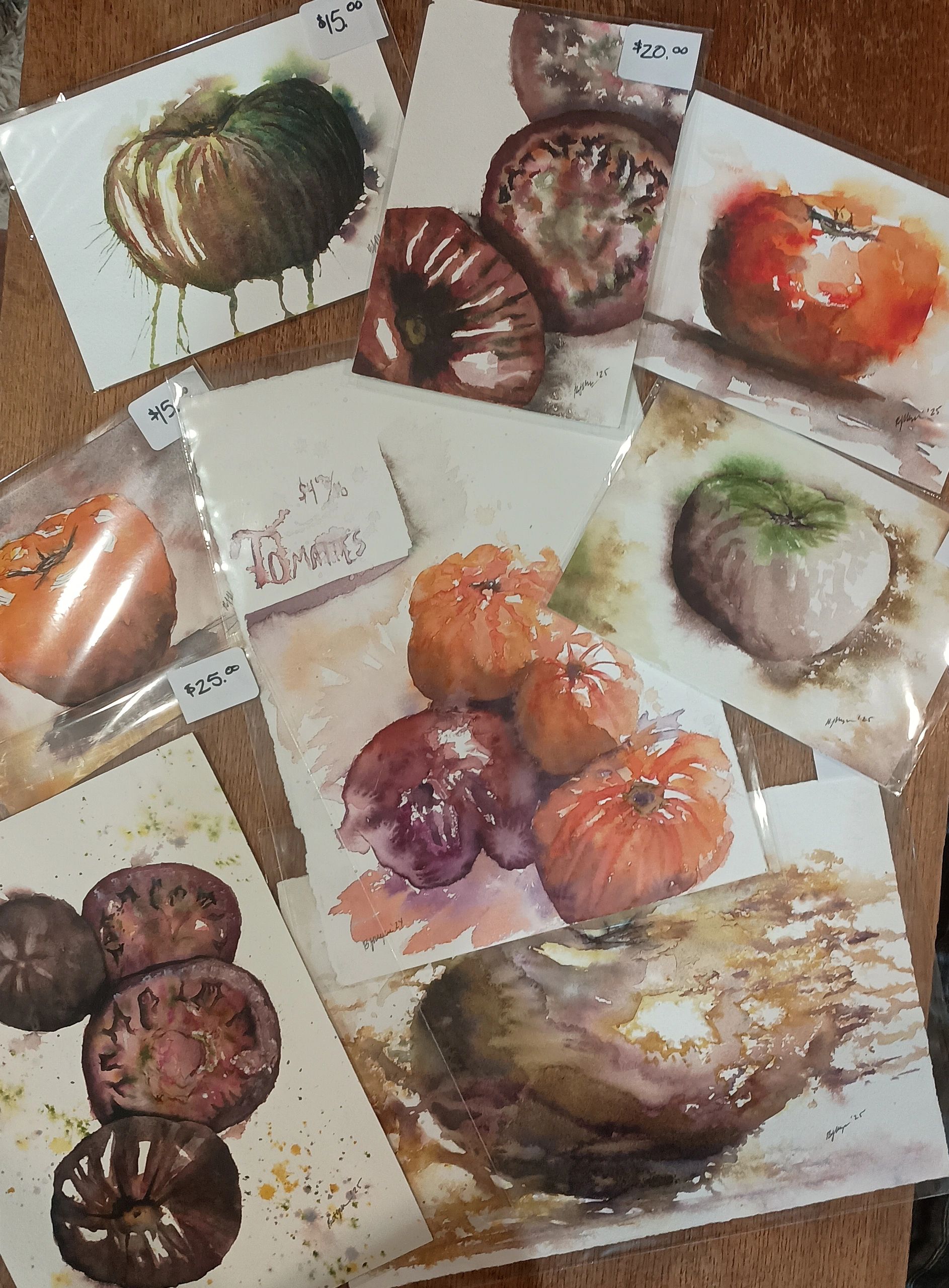 Carrboro Farmers Market Tomato Day. In July I bring a large selection of tomato-themed watercolors to the market's largest special event. Take home a lasting memory of Tomato Day along with actual tomatoes!
